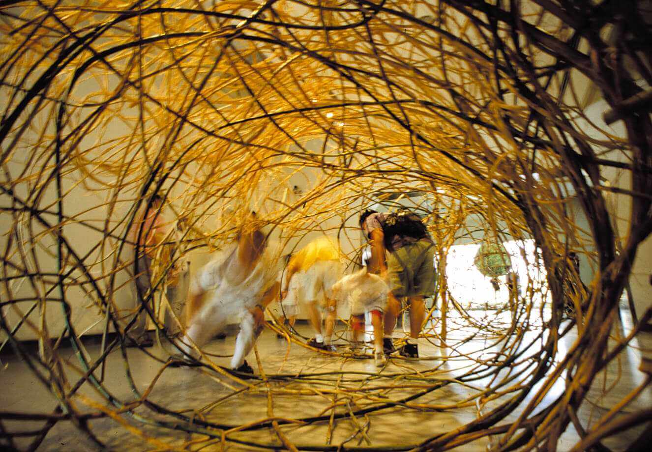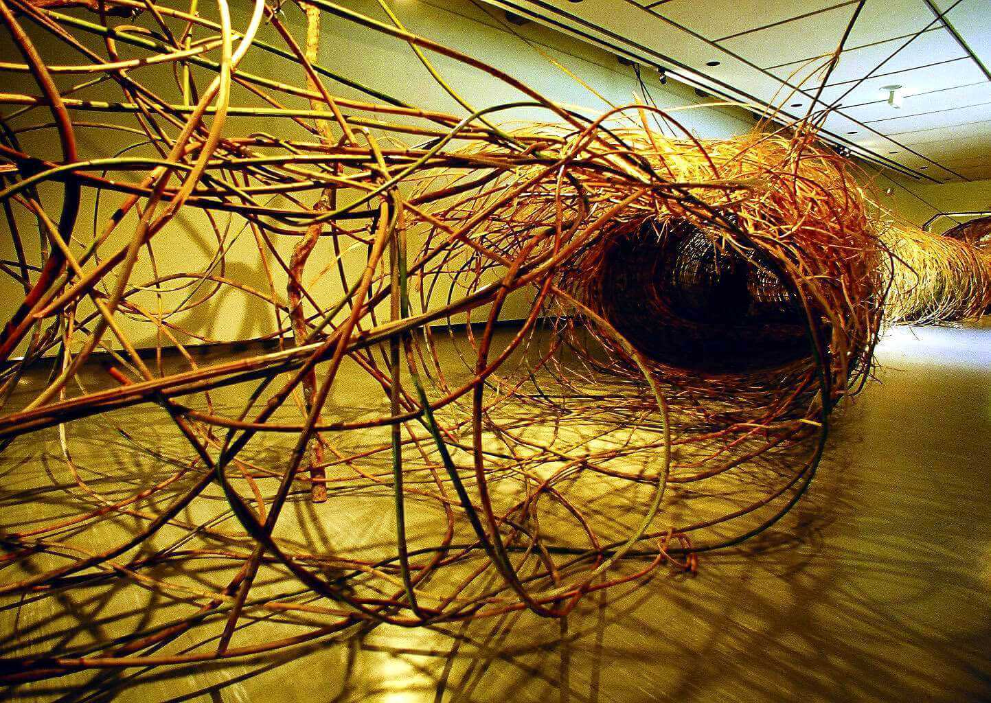 編織多層次將竹材的野性拉拔出來,隨著藝術家的樂章,錯綜交疊鳴出自然素材的藝術元素。