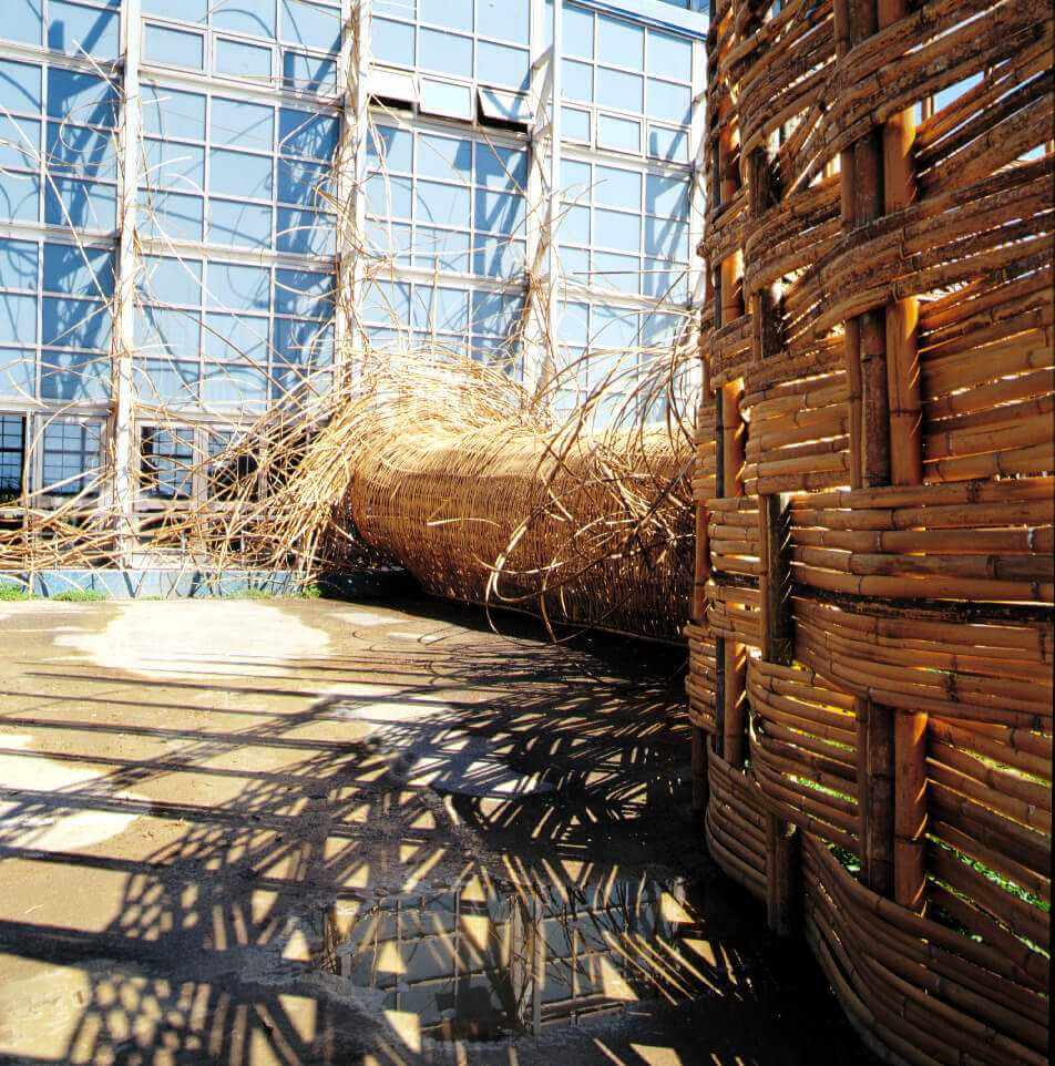 「王文志在作品中慣用的媒材多來自於自然,以竹、藤、原木喚醒人們的身體記憶,在穿梭作品空間的同時頓悟人體與自然的距離。觀者接觸作品之後,身體在材質所營造的氣氛中遊歷,穿梭,忘卻都會叢林的壅擠,體驗失而復得的自然觸覺。貼近或穿透原生材質的過程成為回歸身體的儀式,在緩慢的步履核凝定的傾聽之中,找回生而為人的原性。」